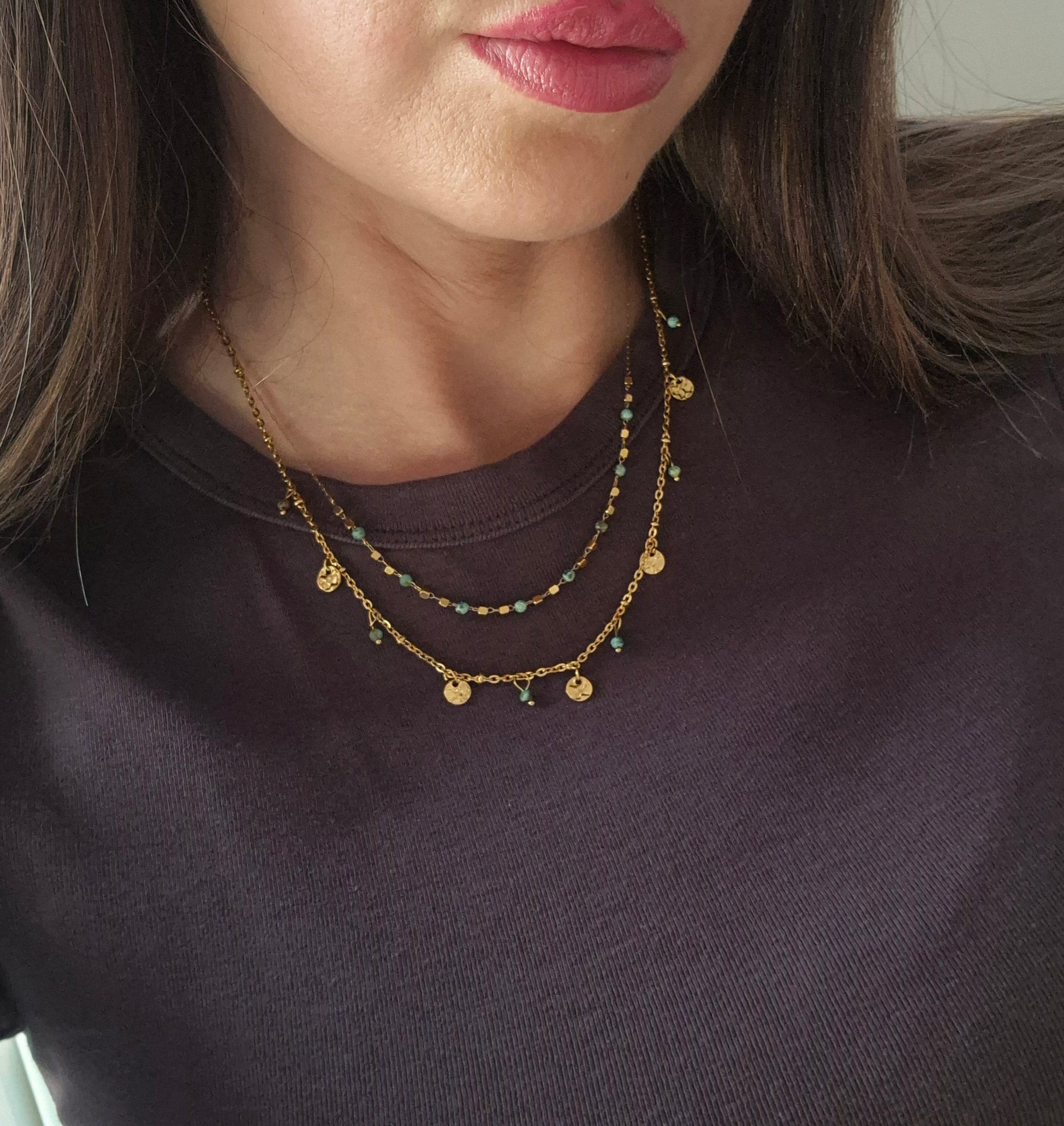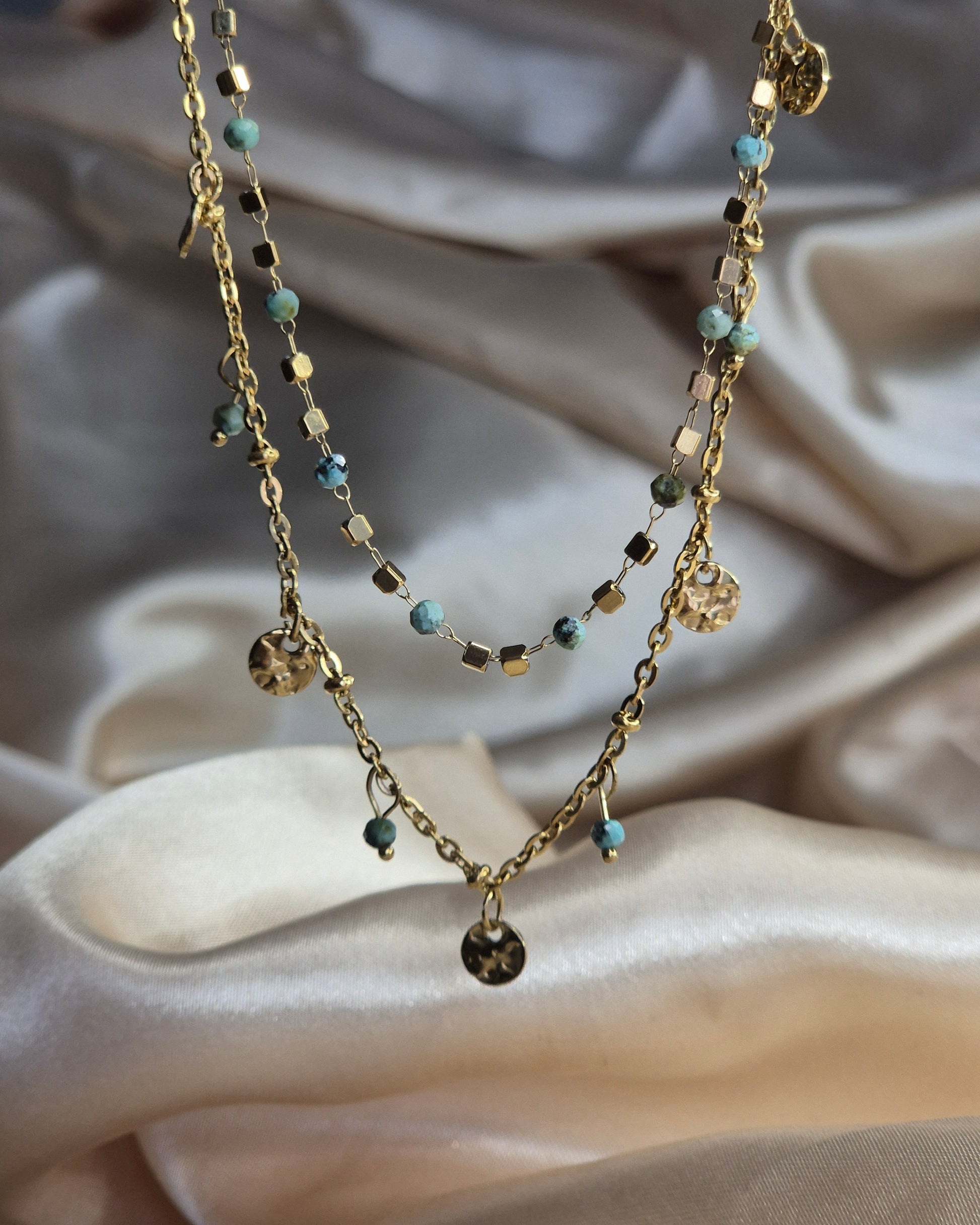 Collier en acier inoxydable et pierres naturelles à double rangs