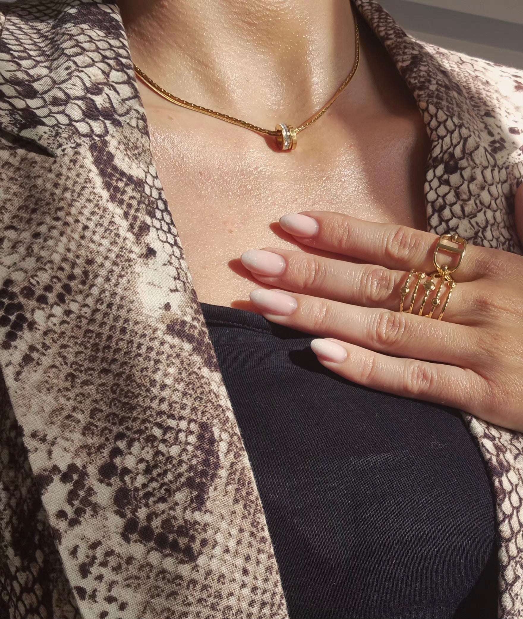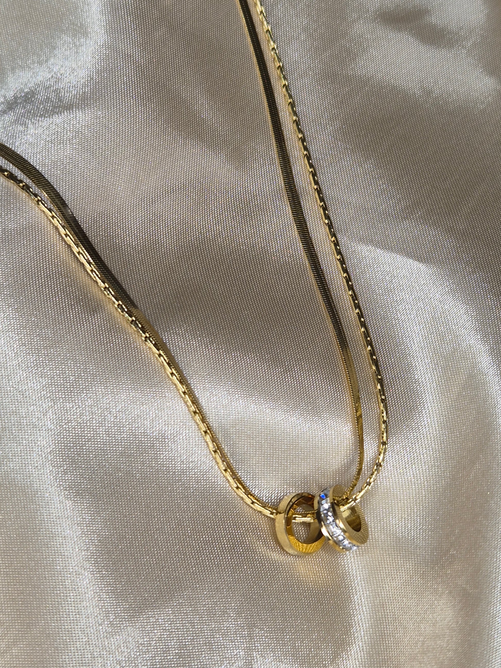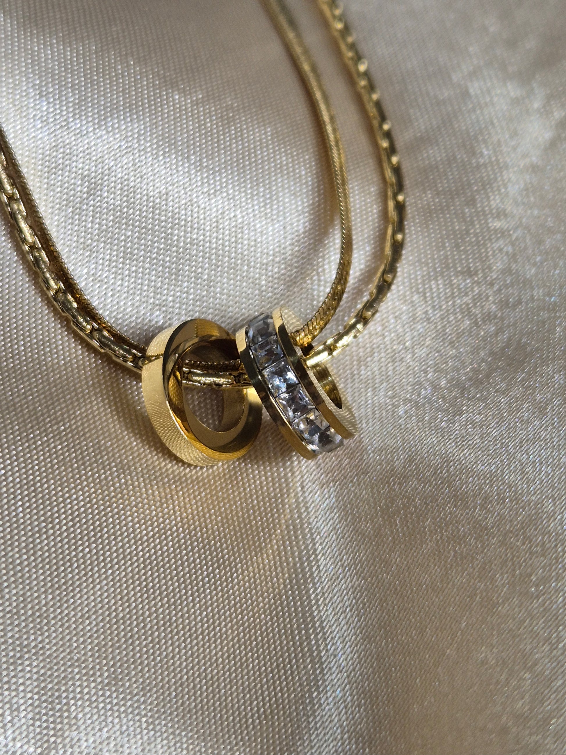 Collier en acier inoxydable double rang , avec une maille plate serpentée et une maille serrée avec double anneaux dont un avec cristaux incrustés.