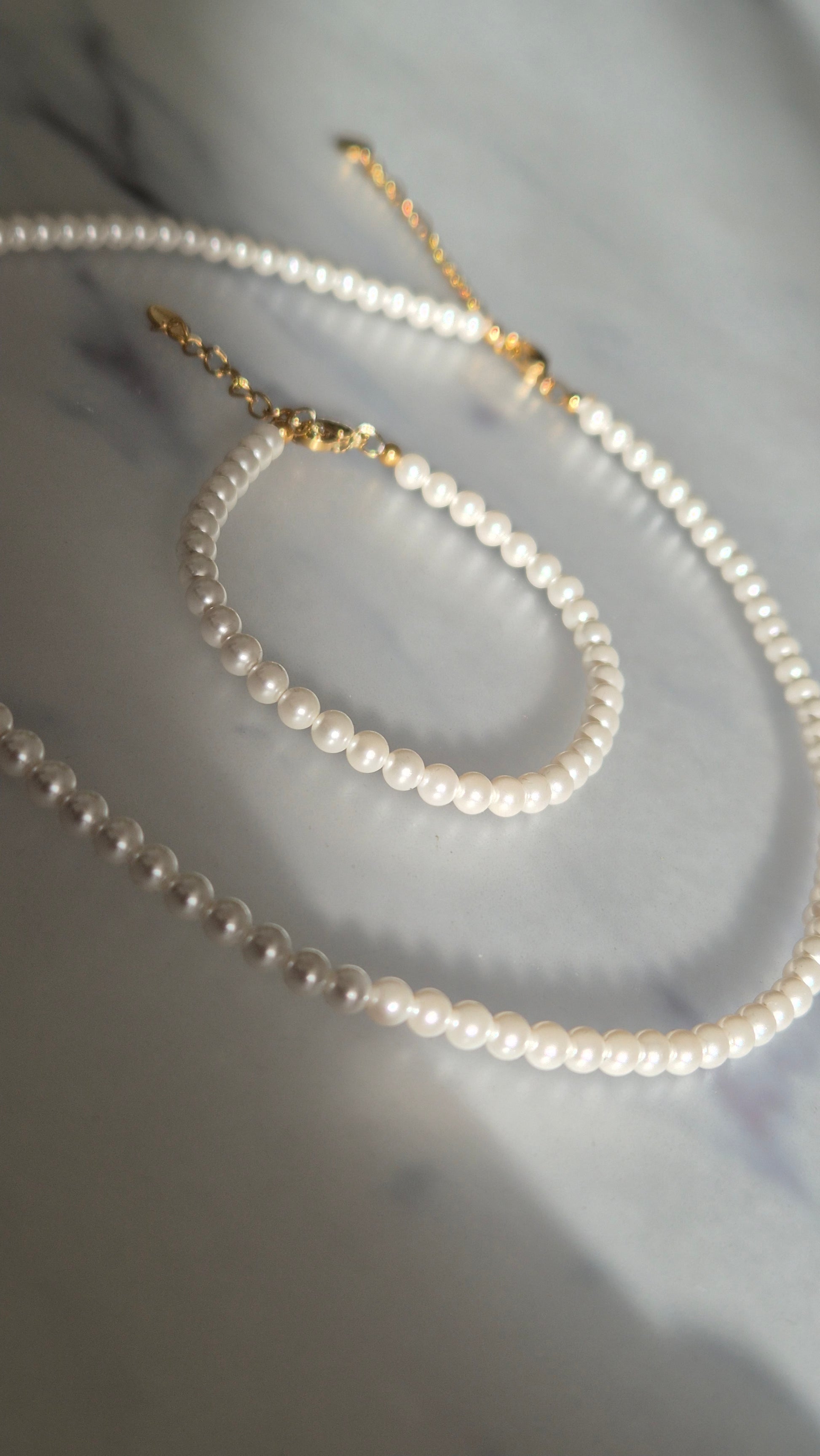 Parure collier et bracelet en perles blanches avec fermoir et chaîne d’extention en acier inoxydable.
